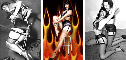 Los hermanos Klaw realizaron con ella sesiones fotográficas bondage y spanking (atada y azotada en directo), que, junto a los tacones de aguja infinitos, fueron la marca de fábrica de la factoría Klaw. También comenzaron a rodar cortometrajes destinados a la venta por correo: Bettie era la modelo más solicitada por los clientes. Y de ahí pasaron a los largometrajes: “Strip-O-Rama”, “Varietease” (¡Bettie bailando la danza de los siete velos!), “Tease-O-Rama” (clásico de culto donde los haya: Bettie comparte pantalla con la incomparable bailarina de striptease Tempest Storm y su danza del desierto). A estas alturas, Bettie estaba en la cumbre de su carrera. Las fotos, las películas y los tebeos acrecientan su fama. En 1955 Bettie es la Playmate de Playboy en su número de diciembre tras desmentir affaires sentimentales con su propietario, Hugh Hefner. Y ahí vino la debacle.