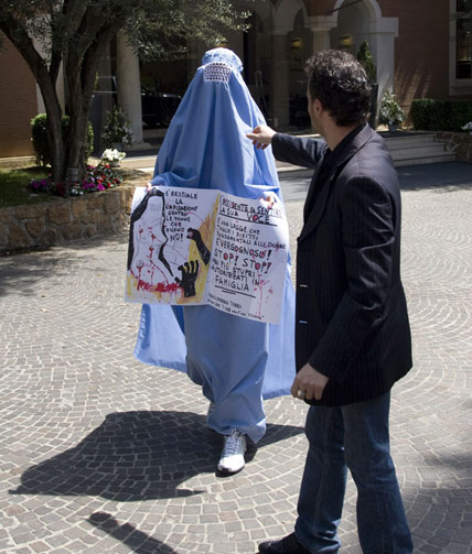 La pornostar italiana Laura Perego es la enésima felactriz que se apunta a la moda del activismo que inauguró hace unas décadas su compatriota Cicciolina y que siguió Sunny Leone en una sonada acción que consistía en afeitarse el coño como protesta a la presidencia del presidente Bush, entre otras. Perego llegó a la embajada afgana ataviada con el burka impuesto por el régimen talibán y que obligaba a toda mujer cubrirse de pies a cabeza. La actriz fue desnudándose hasta quedar en tanga y con un cartel en el que podía leerse “ahora ya pueden lapidarme”. La protesta según la propia actriz era para expresar su rechazo a la nueva ley de inspiración del ex régimen Talibán que, entre otras cosas, permite la violación dentro del matrimonio.