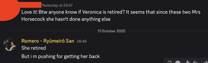 Verónica Leal debe ser una de las actrices colombianas más destacadas de la última década. Su encanto natural, sumado a sus escenas desenfrenadas, la hicieron triunfar ampliamente en Europa. En Legalporno, fue una actriz recurrente en el menú, haciendo escenas de todo tipo (que iban desde escenas individuales, pasando por gangbangs e incluso grabando con trans). Sin embargo, desde fines de 2025 empezó a circular la noticia de que Verónica se estaba retirando. La primera señal fue en un live de Instagram, donde anunciaba que ya no grabaría más en Legal Porno. Y en Diciembre del 2025, el director de Hentaied informaba en su canal de Discord que Verónica Leal estaba retirada de la industria.
