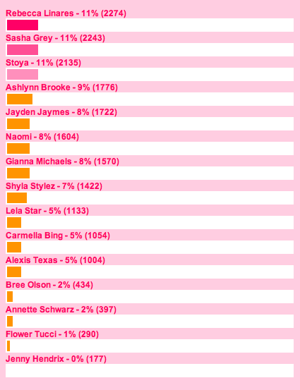 Aunque con empate técnico, ya tenemos vencedora. Vuestras votaciones han coronado a Rebecca Linares como la Mejor Pornostar Orgasmatrix 2008. Las 15 nominadas recibieron un total de votaciones que rozaban las 20.000. Rebecca se ha impuesto con 2.274 votos y con sólo 30 votos de diferencia respecto a Sasha Grey. Ha sido un duelo muy disputado que no se ha decidido hasta el final, estando Sasha Grey en cabeza en varias ocasiones. Y aunque las reglas son las reglas y en el trono sólo cabe una de ellas, Sasha Grey merece una mención especial por este ajustado resultado.
